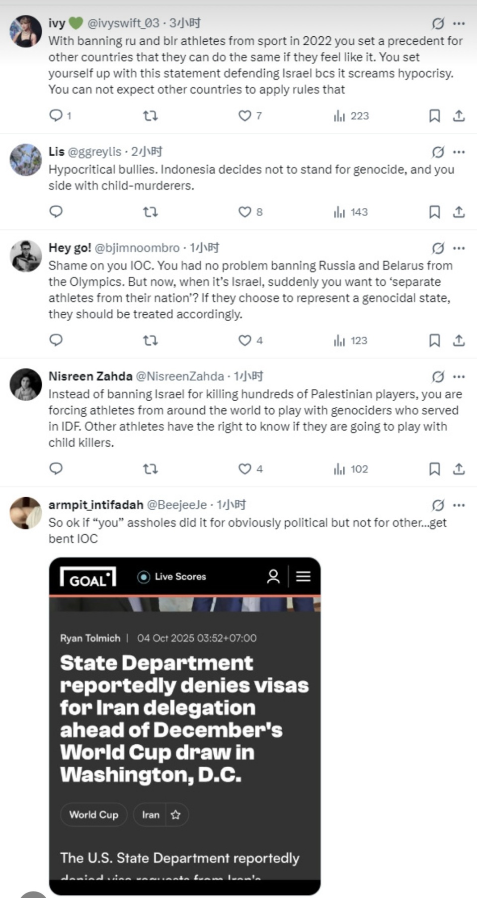 而在国际奥委会官方社媒的评论区,外国网友也非常愤怒,有网友表示:“你们没有因为以色列杀害数百名巴勒斯坦运动员而禁止其参赛,反而强迫来自世界各地的运动员与曾在以色列军队服役的人同场竞技,其他运动员有权知道他们是否要与杀害儿童的凶手同场竞技。”